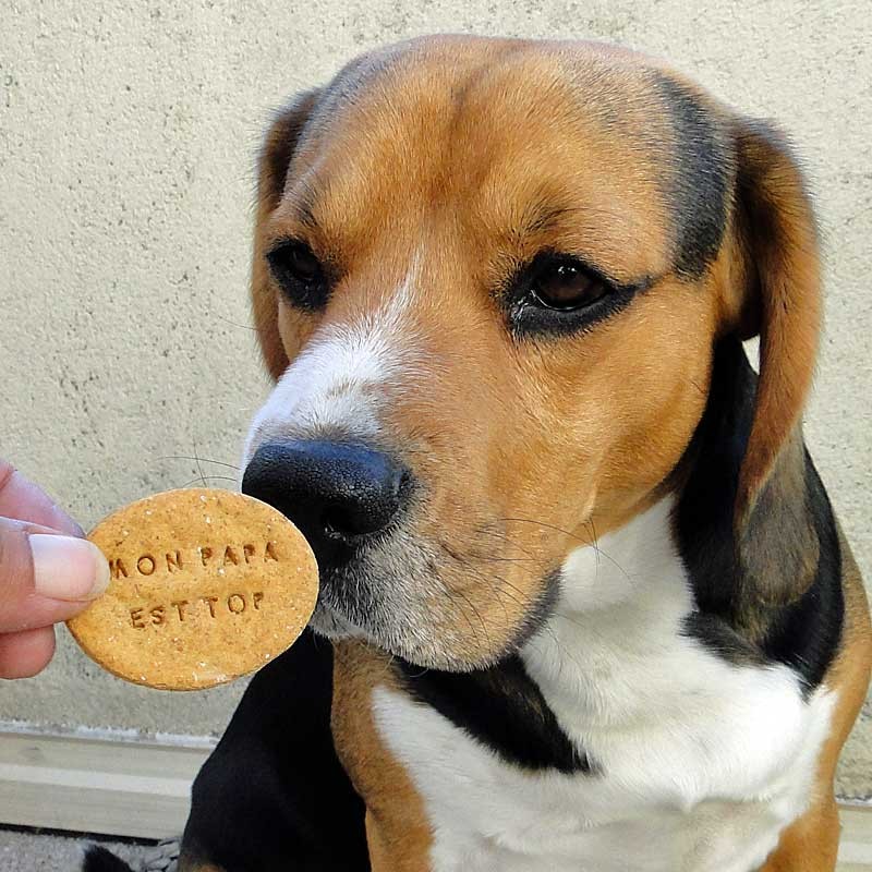 Voici une idée cadeau fantastique pour le papa de votre toutou ! Biscuits pour chien, estampillés avec des messages d'amour.