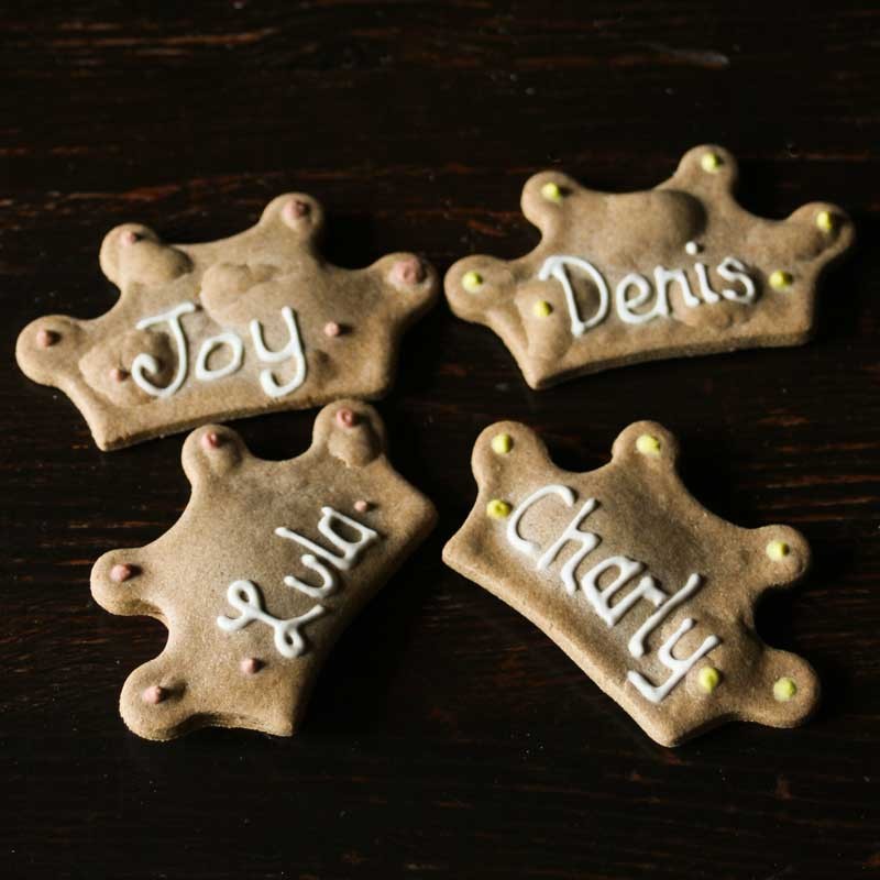 Marque-places couronne personnalisables. Et en plus qui se mange ! Sachet de 4 biscuits BIO.