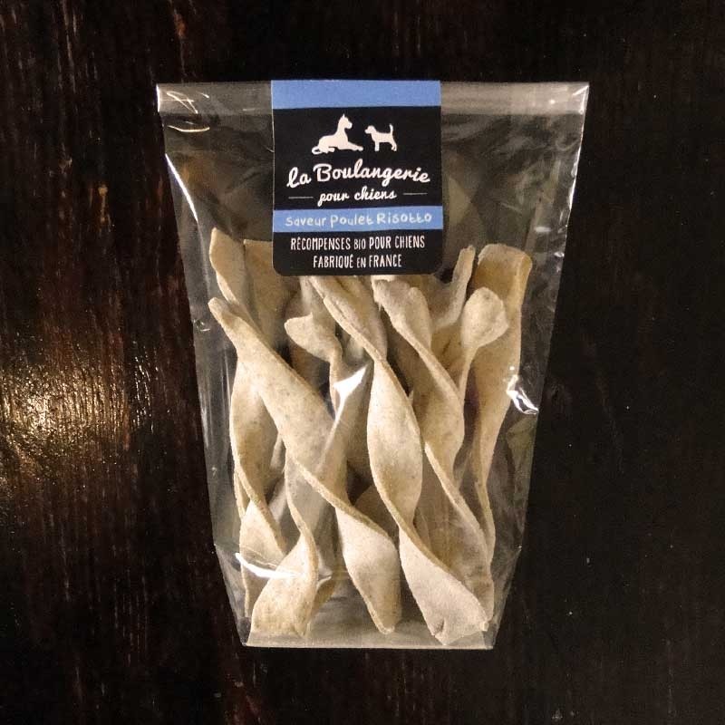 Organic twists biscuits, ideal for puppies and dogs of all ages. Home-made in France for your furry friend.